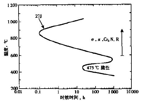 SAF 2507雙相不銹鋼管學(xué)性能 表1列出鋼管和鋼板的室溫力學(xué)性能,表2為鋼板的高溫力學(xué)性能。圖1為相應(yīng)韌性為27J的時(shí)間–溫度–相變曲線。有σ相和475℃兩個(gè)脆性區(qū)。 表1 SAF 2507雙相不銹鋼的室溫力學(xué)性能 鋼種 鋼材品種 σb ∕MPa σ0.2 ∕MPa δ5 ∕% HV AK ∕J SAF 2507 壁厚<20mm 管 800~1000 ≥550 ≥25 290 熱軋鋼板 730 530 20 60 表2 SAF 2507雙相不銹鋼的高溫力學(xué)性能 鋼種 鋼材品種 溫度 ∕℃ σ0.2 ∕MPa SAF 2507 鋼板 室溫 ≥530 100 ≥450 200 ≥400